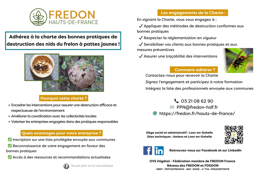 Afin d’harmoniser les pratiques et de garantir des interventions à la fois efficaces, sécurisées et respectueuses de l’environnement, une Charte des bonnes pratiques de destruction des nids du frelon à pattes jaunes a été élaborée. Elle définit un protocole technique de référence, attentif à la protection des populations comme à la sécurité des opérateurs.