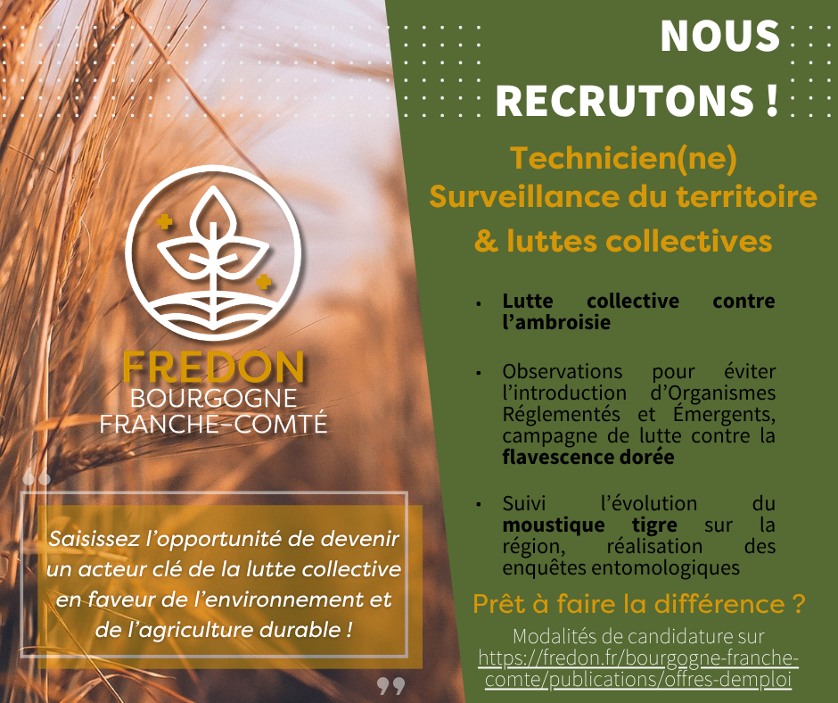 Prêt(e) à relever ce défi ? Envoyez votre candidature (CV + lettre de motivation + prétentions) par e-mail à mcpaput@fredonbfc.fr, à l’attention de Marie-Charlotte PAPUT, Directrice de FREDON Bourgogne Franche-Comté.