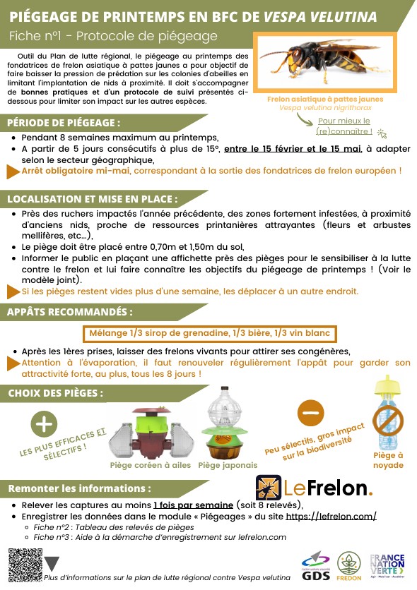 2025 : Grâce à la mise en place d’un partenariat entre les Organismes à Vocation Sanitaire dans le domaine animal (GDS BFC) et végétal (FREDON BFC), et au concours financier du gouvernement via le Fonds Vert, un plan de lutte régional contre le frelon asiatique à pattes jaunes a pu être redéployé sur une grande partie de la région BFC en 2025.