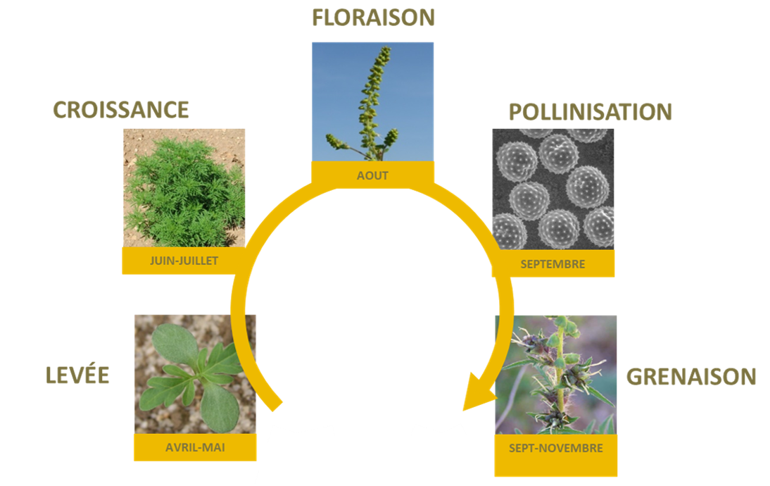 Son pollen est très allergisant, il suffit de quelques grains de pollen par mètre cube d’air pour que les symptômes apparaissent. 6 à 12 % de la population exposée sont allergiques à l’ambroisie. En pleine expansion, elle colonise une grande partie de la France depuis les années 2000. Les pollens sont libérés d’août à septembre avec généralement un pic vers la mi-août.