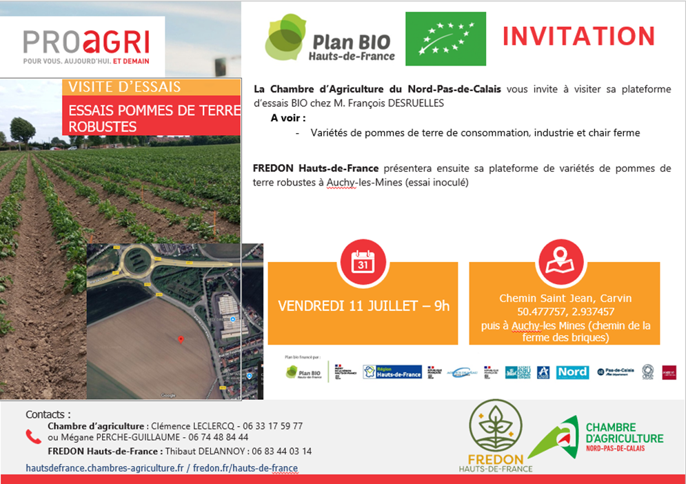 • Une visite le vendredi 12 juillet 2024 pour la vitrine de 35 variétés robustes à Carvin (Chambre d’agriculture du Pas-de-Calais) puis l’essai de 15 variétés robustes inoculées avec du mildiou à Auchy-les Mines (FREDON Hauts-de-France)