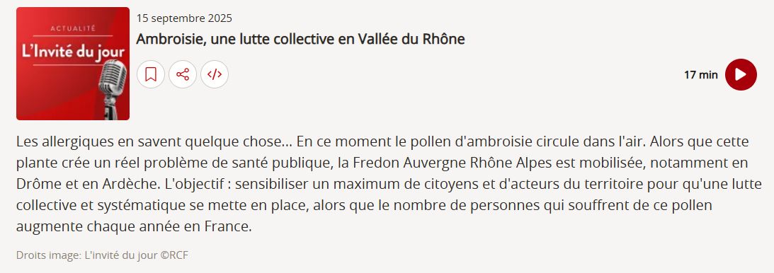 - RCF - L'invité du jour du 15 septembre 2025 : Ambroisie, une lutte collective en Vallée du Rhône