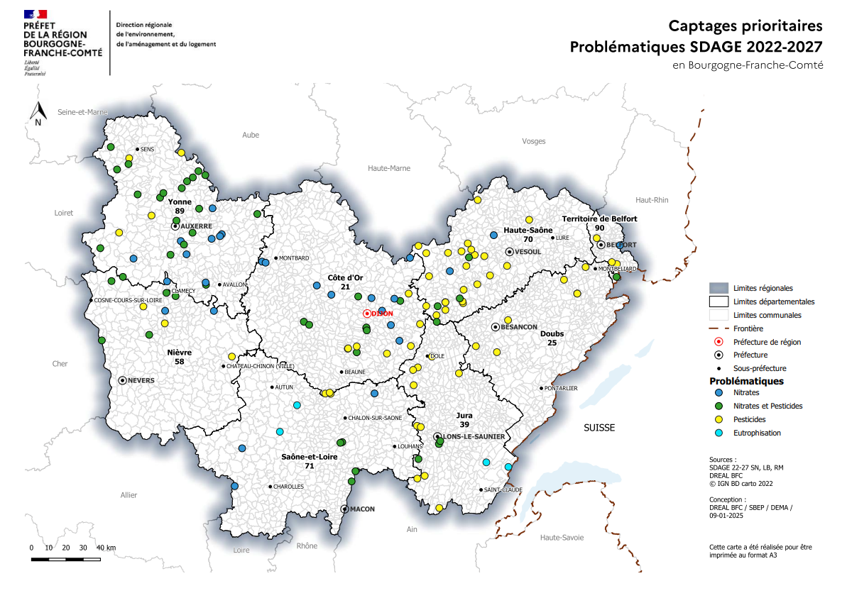 La Bourgogne–Franche-Comté est la 2ᵉ région de France la plus concernée par les captages prioritaires, avec 136 captages, dont 77 % classés en raison de contaminations par les pesticides. Par ailleurs, les Schémas directeurs d’aménagement et de gestion des eaux (SDAGE) montrent que les pesticides sont à l’origine du mauvais état chimique de 90 % des masses d’eaux souterraines et de 45 % des masses d’eaux superficielles en région.