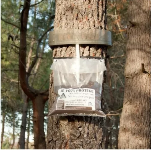 La méthode la plus efficace à cette période est la pose d’écopièges autour des troncs d’arbres infestés (cf. image).