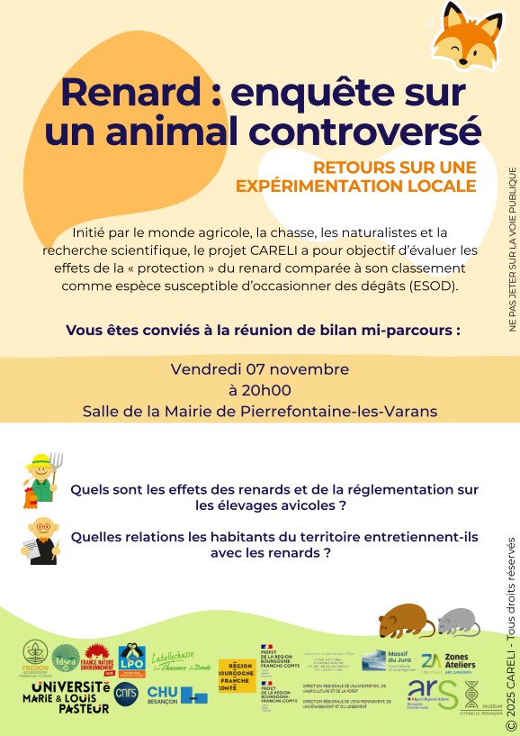 Dans le cadre d’un bilan à mi-parcours du programme CARELI, une recherche-action participative sur le statut du renard menée depuis cinq ans dans le Doubs par des chercheurs, agriculteurs, chasseurs et naturalistes, nous organisons deux soirées grand public :
