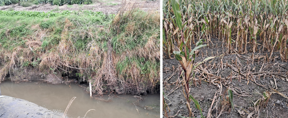 Dégâts sur berges et sur culture de maïs en Flandre Maritime. Crédits Photographiques : FREDON Hauts-de-France